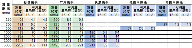 主要距離對應(yīng)的 測量尺寸 (尺寸/ 距離) | 約98mm / 250mm | 約145mm / 200mm | 約115mm / 900mm | 約57mm / 500mm (固定) | 約27mm / 300mm (固定) | |