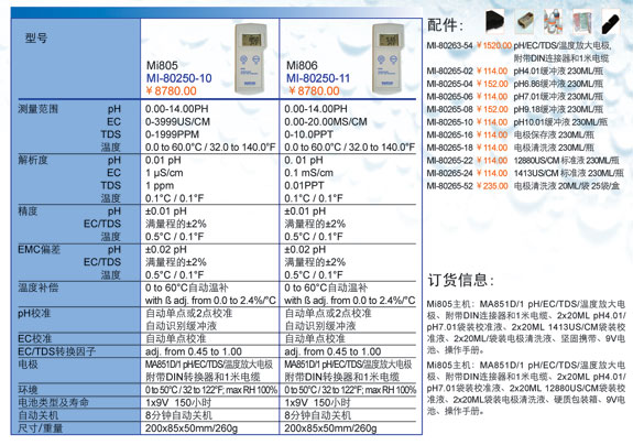 Mi805 和 Mi806位您提供了一個(gè)測(cè)量ph/電導(dǎo)率,溶解總固體和溫度為一體的測(cè)試儀