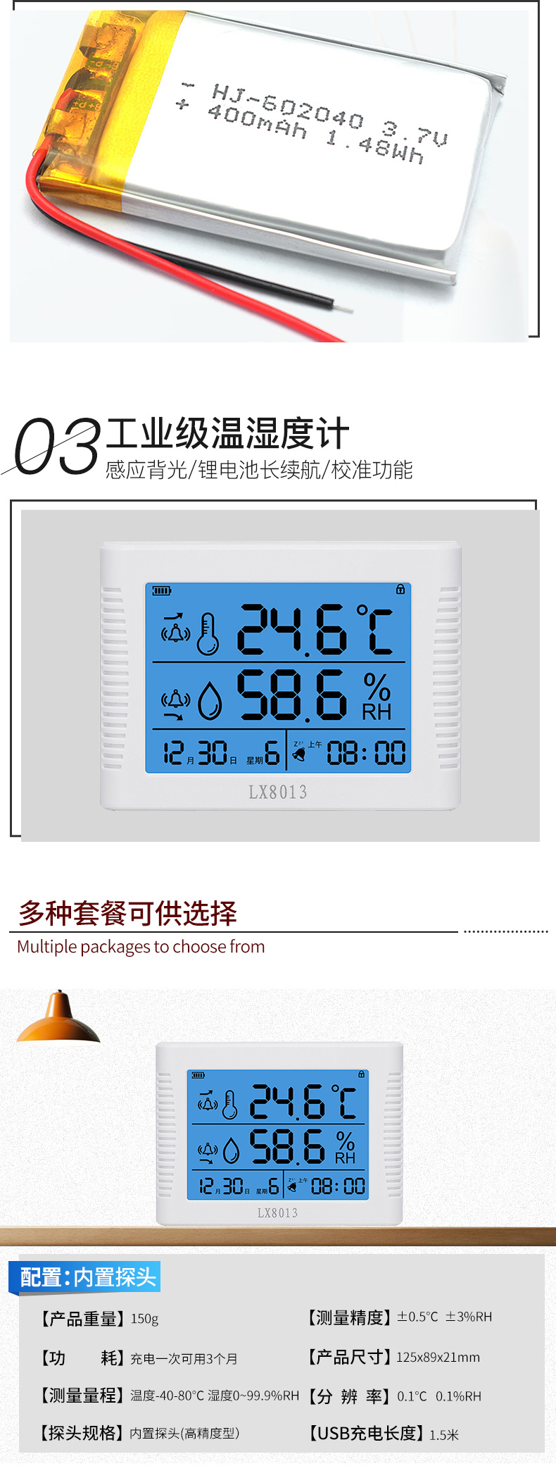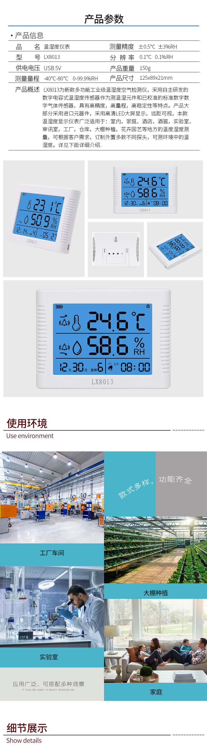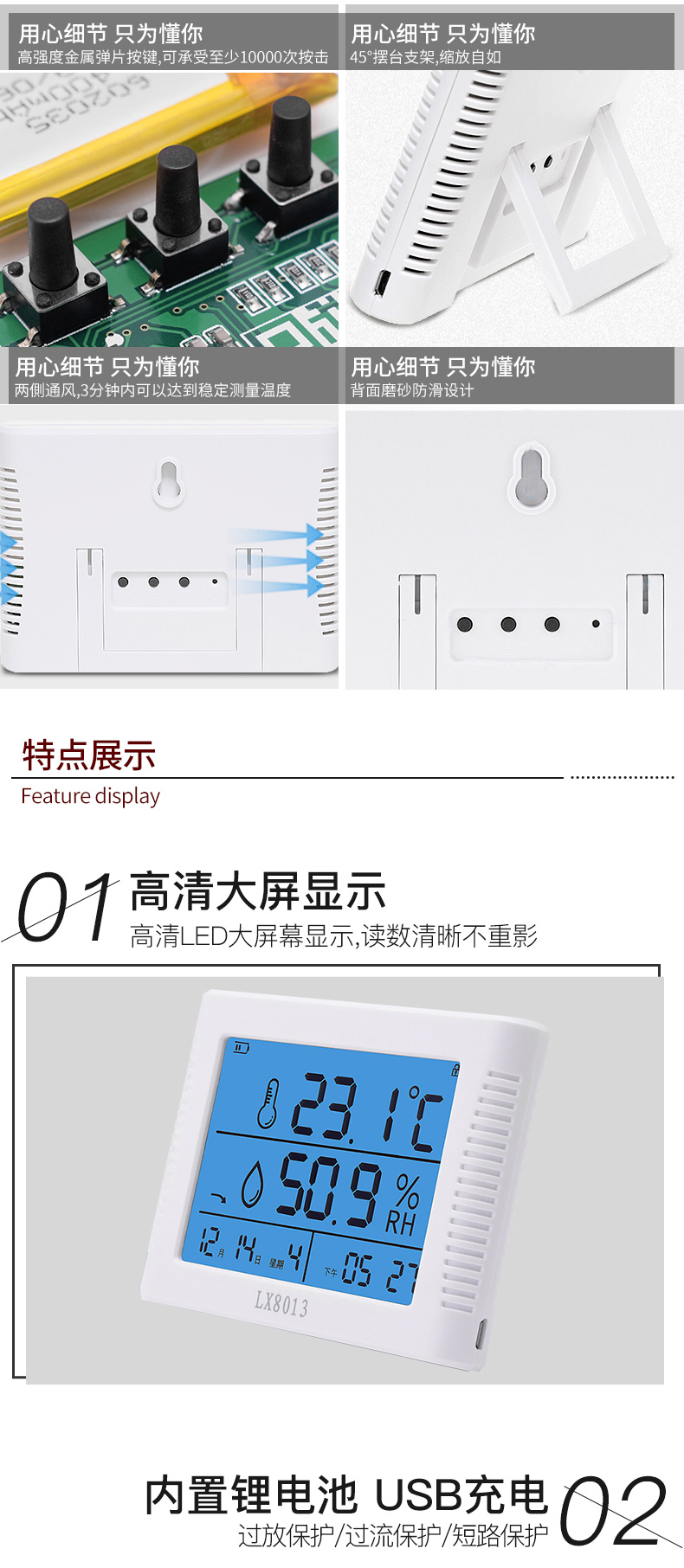 LX8013溫濕度顯示儀主要用于家庭或個人用的溫濕度顯示儀,具有反應速度快、測量精度高、穩(wěn)定性好、實用性強等特點,產(chǎn)品帶有溫濕度報警、時間、鬧鐘、溫濕度校準、℃/℉切換、恢復出廠設置等功能。產(chǎn)品采用工業(yè)級高精度溫濕度傳感器做測溫濕元件,進口精密線路板等元件制作.