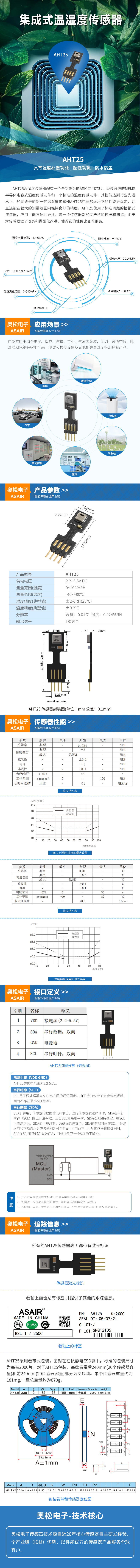 AHT25溫濕度傳感器配有一個全新設(shè)計的ASIC專用芯片、經(jīng)過改進(jìn)的MEMS半導(dǎo)體電容式濕度傳感元件和一個標(biāo)準(zhǔn)的溫度傳感元件,精度高、穩(wěn)定性好、抗干擾能力強(qiáng),即使在惡劣的環(huán)境也能發(fā)揮穩(wěn)定性能;使用標(biāo)準(zhǔn)I2C接口,響應(yīng)迅速,出廠時均經(jīng)過溫度補(bǔ)償,功耗非常低,是眾多低功耗產(chǎn)品的理想選擇。