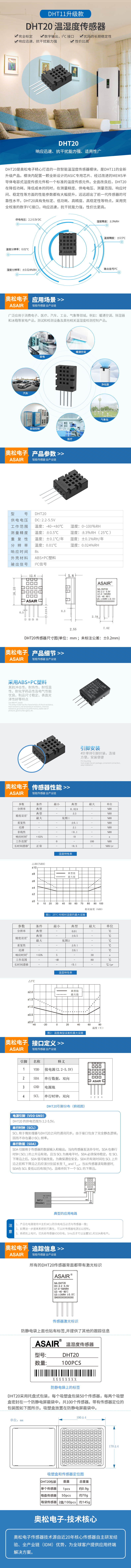 DHT20是奧松電子精心打造的一款智能溫濕度傳感器模塊,是DHT11的全新升級(jí)產(chǎn)品。模塊內(nèi)配置一顆全新設(shè)計(jì)的ASIC專用芯片、經(jīng)過改進(jìn)的MEMS半導(dǎo)體電容式濕度傳感元件和一個(gè)標(biāo)準(zhǔn)的溫度傳感元件。全面改良后,DHT20在降低功耗、降低成本的同時(shí),在測(cè)量精度、供電電壓、測(cè)量范圍、響應(yīng)時(shí)間、穩(wěn)定性等方面的性能參數(shù)都有大幅提升,遠(yuǎn)遠(yuǎn)超出了前一代傳感器的可靠性水平。DHT20具有免標(biāo)定、低功耗、高精度、高穩(wěn)定性等特點(diǎn),采用完全校準(zhǔn)的數(shù)字I2C接口,響應(yīng)迅速,抗干擾能力強(qiáng),性價(jià)比更高。