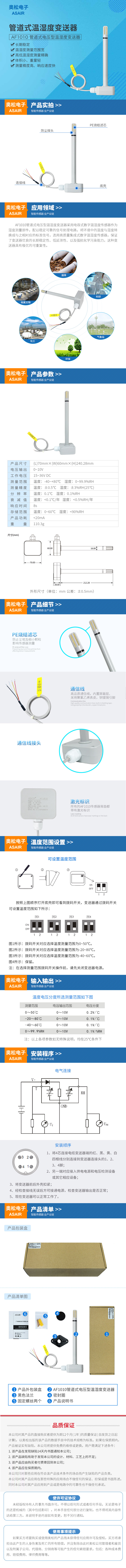 AF1010 管道式電壓型溫濕度變送器采用數(shù)字溫濕度傳感器作為濕度測量部件,配以穩(wěn)定可靠的信號處理電路,將環(huán)境中的溫度與濕度轉(zhuǎn)換成與之相對應(yīng)的標準信號,選用高質(zhì)量集成式數(shù)字溫濕度傳感器,保證了變送器優(yōu)良的長期穩(wěn)定性、低延滯性、以及強抗化學(xué)污染能力,這種變送器具有極優(yōu)的可重復(fù)性。