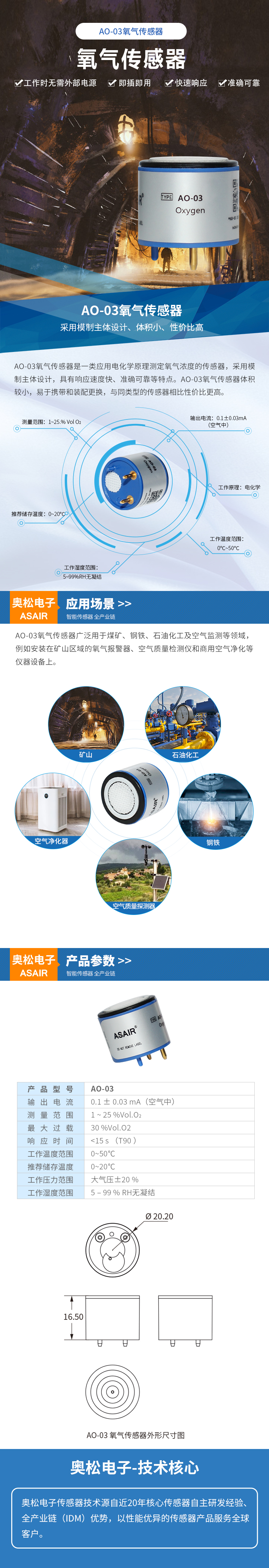 AO-03氧氣傳感器廣泛用于煤礦、鋼鐵、石油化工及空氣監(jiān)測等領(lǐng)域,例如安裝在礦山區(qū)域的氧氣報(bào)警器、空氣質(zhì)量檢測儀和商用空氣凈化等儀器設(shè)備上。