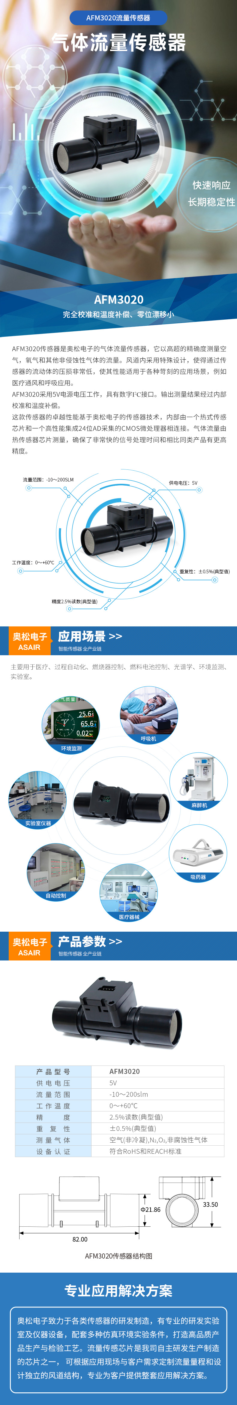 AFM3020傳感器是奧松電子的氣體流量傳感器,它以高超的精確度測量空氣,氧氣和其他非侵蝕性氣體的流量。風(fēng)道內(nèi)采用特殊設(shè)計(jì),使得通過傳感器的流動體的壓損非常低,使其性能適用于各種苛刻的應(yīng)用場景,例如醫(yī)療通風(fēng)和呼吸應(yīng)用。