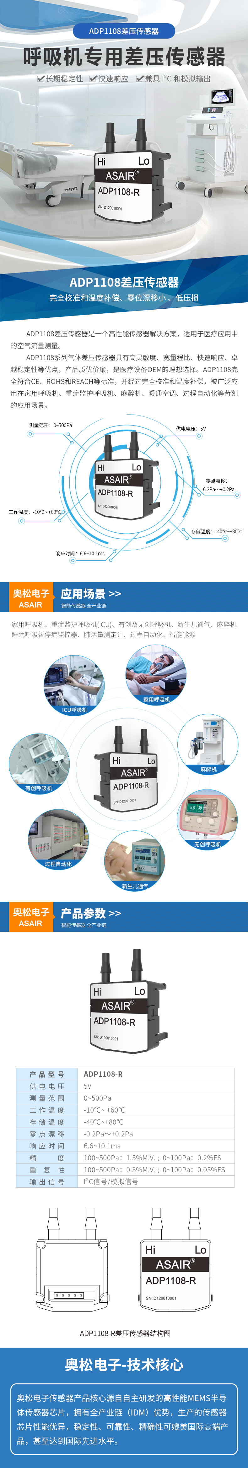 ADP1108差壓傳感器是一個高性能傳感器解決方案,適用于醫(yī)療應用中的空氣流量測量。 ADP1108系列氣體差壓傳感器具有高靈敏度、寬量程比、快速響應、卓越穩(wěn)定性等優(yōu)點,產品質優(yōu)價廉,是醫(yī)療設備 OEM 的理想選擇。 ADP1108 完全符合CE、 RoHS和 REACH等標準,并經過完全校準和溫度補償,被廣泛應用在家用呼吸機、重癥監(jiān)護呼吸機、麻醉機、暖通空調、過程自動化等苛刻的應用場景。