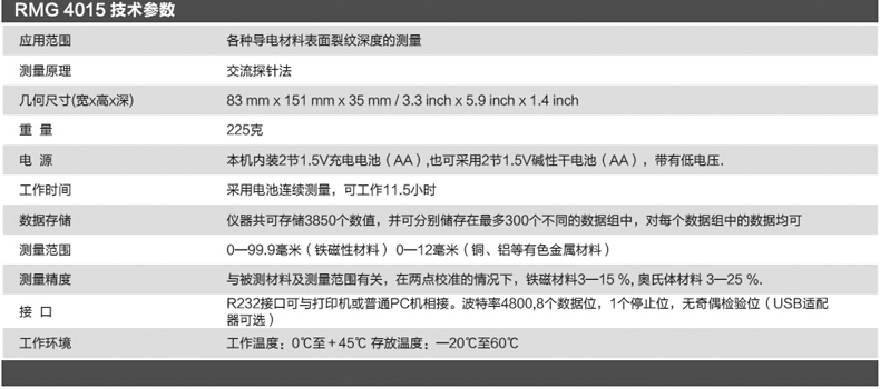 德國(guó)KDRMG4015裂紋測(cè)深儀的技術(shù)細(xì)節(jié)與其它傳統(tǒng)儀器相似,通過(guò)工件的電流值為500mA。但是對(duì)比目前那些探頭一旦接觸就產(chǎn)生持續(xù)電流的儀器,德國(guó)KDRMG4015裂紋測(cè)深儀在一次檢測(cè)中只產(chǎn)生持續(xù)幾毫秒的電流脈沖。重復(fù)速率將近一秒一次檢測(cè)。顯示隨之更新。這樣,儀器使用電池時(shí)可以在探頭連續(xù)接觸情況下工作12小時(shí)。如果使用充電電池,儀器可不必打開(kāi),電池能通過(guò)外置的充電器充電。薄膜鍵盤(pán)是由按鍵組成,可以直接進(jìn)入儀器的基本測(cè)量功能。德國(guó)KDRMG4015裂紋測(cè)深儀許多參數(shù)可以通過(guò)菜單鍵顯示。參數(shù)用清晰的語(yǔ)言顯示(英語(yǔ)或德語(yǔ))。操作和傳統(tǒng)的壁厚、涂層厚度測(cè)量?jī)x一樣簡(jiǎn)單容易。德國(guó)KDRMG4015裂紋測(cè)深儀儀器的數(shù)據(jù)記錄器可以處理超過(guò)3850個(gè)測(cè)量結(jié)果,可以存儲(chǔ)超過(guò)300個(gè)獨(dú)立數(shù)據(jù)。內(nèi)置的實(shí)時(shí)時(shí)鐘自動(dòng)記錄測(cè)量數(shù)據(jù)和測(cè)量時(shí)間。測(cè)量可通過(guò)系列界面打印出。相同的界面也允許與PC通信,通過(guò)WINDOWS操作系統(tǒng)的應(yīng)用程序程序“STATUS WINDOWS”。它不僅有傳輸功能,也能處理和圖表顯示測(cè)量值。