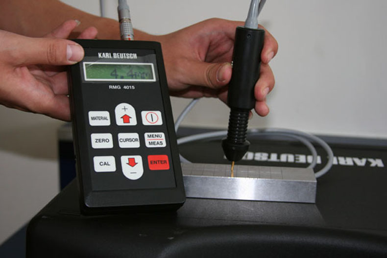 德國(guó)KDRMG4015裂紋測(cè)深儀提供一個(gè)帶有從0mm到10mm深度人工裂紋的校準(zhǔn)試塊,這樣用戶可在測(cè)量期間校準(zhǔn)儀器和探頭。探針的磨損或超過(guò)范圍的溫度導(dǎo)致的偏差可通過(guò)再校準(zhǔn)補(bǔ)償。正確的值可以儲(chǔ)存在探頭中。裂紋深度內(nèi)的測(cè)量電壓轉(zhuǎn)換是由RMG 4015的微處理器控制的。出廠設(shè)置的校準(zhǔn)表正是出于此目的存儲(chǔ)在儀器中的。測(cè)量之前,將探頭放于工件無(wú)裂紋處,測(cè)量電壓與校準(zhǔn)表中的存儲(chǔ)值相比較。微處理器根據(jù)材料的特殊性來(lái)確定以后測(cè)量裂紋的確切深度。測(cè)量由微處理器監(jiān)控。由于不充分探針的接觸而導(dǎo)致的誤操作、錯(cuò)誤的接觸或探頭的顫動(dòng)是可以避免的。這樣,錯(cuò)誤的結(jié)果幾乎不可能發(fā)生。可以獲得佳的測(cè)量再線性性(+/-0.1mm100mm裂紋深度)。即使是低標(biāo)號(hào)鋼或無(wú)滲透(如奧氏體鋼)或高導(dǎo)電的非鐵性材料(如鋁或銅),都能獲得足夠的精度。