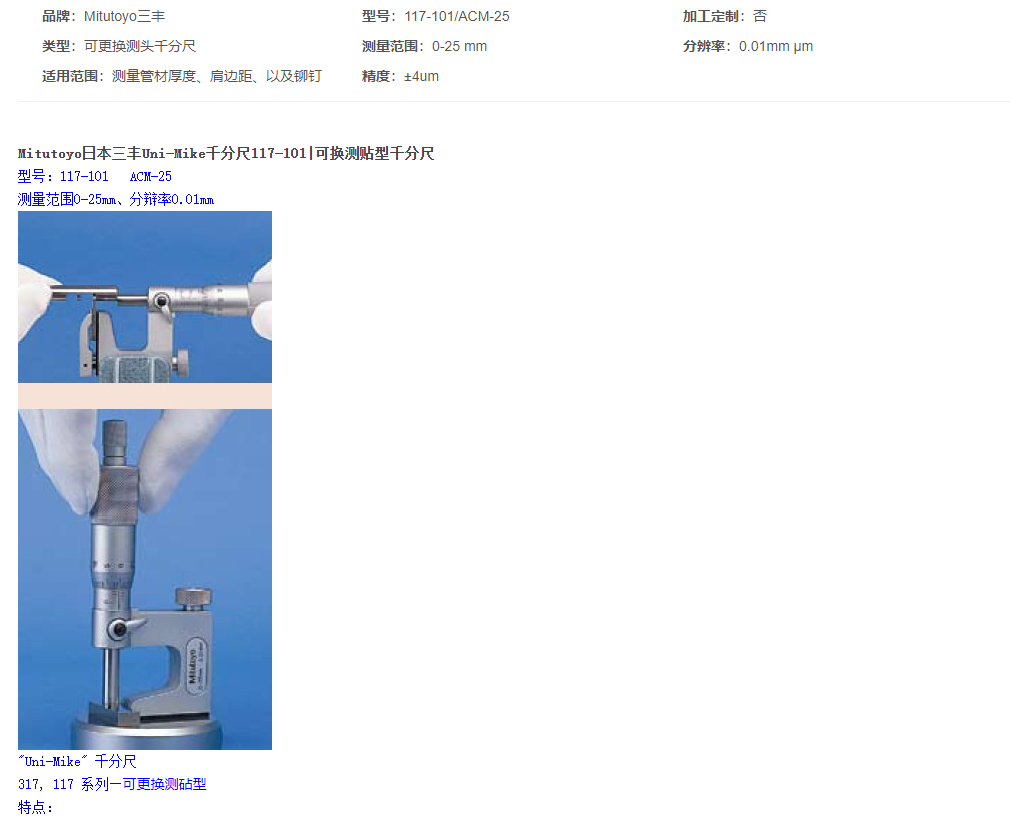 本網(wǎng)頁所展示的有關(guān)【三豐 Uni-Mike117-101千分尺|可換測貼型千分尺】的信息/圖片/參數(shù)等由的會員【日本三豐mitutoyo-深圳柏萊科技有限公司 】提供,由柏萊儀器網(wǎng)-專業(yè)銷售儀器儀表服務(wù)商-深圳柏萊科技有限公司會員【日本三豐mitutoyo-深圳柏萊科技有限公司 】自行對信息/圖片/參數(shù)等的真實(shí)性、準(zhǔn)確性和合法性負(fù)責(zé),本平臺(本網(wǎng)站)僅提供展示服務(wù),請謹(jǐn)慎交易,因交易而產(chǎn)生的法律關(guān)系及法律糾紛由您自行協(xié)商解決,本平臺(本網(wǎng)站)對此不承擔(dān)任何責(zé)任。您在本網(wǎng)頁可以瀏覽【三豐 Uni-Mike117-101千分尺|可換測貼型千分尺】有關(guān)的信息/圖片/價格等及提供 【三豐 Uni-Mike117-101千分尺|可換測貼型千分尺】的商家公司簡介、聯(lián)系方式等信息。