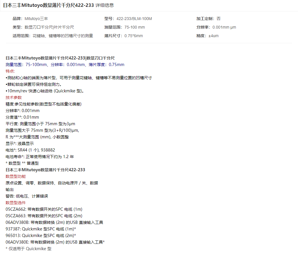 本網(wǎng)頁所展示的有關(guān)【三豐 422-233數(shù)顯薄片千分尺】的信息/圖片/參數(shù)等由的會員【日本三豐mitutoyo-深圳柏萊科技有限公司 】提供,由柏萊儀器網(wǎng)-專業(yè)銷售儀器儀表服務(wù)商-深圳柏萊科技有限公司會員【日本三豐mitutoyo-深圳柏萊科技有限公司 】自行對信息/圖片/參數(shù)等的真實性、準確性和合法性負責,本平臺(本網(wǎng)站)僅提供展示服務(wù),請謹慎交易,因交易而產(chǎn)生的法律關(guān)系及法律糾紛由您自行協(xié)商解決,本平臺(本網(wǎng)站)對此不承擔任何責任。您在本網(wǎng)頁可以瀏覽【三豐 422-233數(shù)顯薄片千分尺】有關(guān)的信息/圖片/價格等及提供 【三豐 422-233數(shù)顯薄片千分尺】的商家公司簡介、聯(lián)系方式等信息。