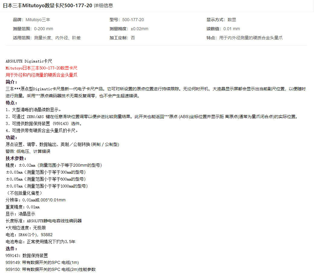 本網(wǎng)頁所展示的有關(guān)【三豐 500-177-20Mitutoyo數(shù)顯卡尺】的信息/圖片/參數(shù)等由的會員【日本三豐mitutoyo-深圳柏萊科技有限公司 】提供,由柏萊儀器網(wǎng)-專業(yè)銷售儀器儀表服務(wù)商-深圳柏萊科技有限公司會員【日本三豐mitutoyo-深圳柏萊科技有限公司 】自行對信息/圖片/參數(shù)等的真實性、準(zhǔn)確性和合法性負(fù)責(zé),本平臺(本網(wǎng)站)僅提供展示服務(wù),請謹(jǐn)慎交易,因交易而產(chǎn)生的法律關(guān)系及法律糾紛由您自行協(xié)商解決,本平臺(本網(wǎng)站)對此不承擔(dān)任何責(zé)任。您在本網(wǎng)頁可以瀏覽【三豐 500-177-20Mitutoyo數(shù)顯卡尺】有關(guān)的信息/圖片/價格等及提供 【三豐 500-177-20Mitutoyo數(shù)顯卡尺】的商家公司簡介、聯(lián)系方式等信息。