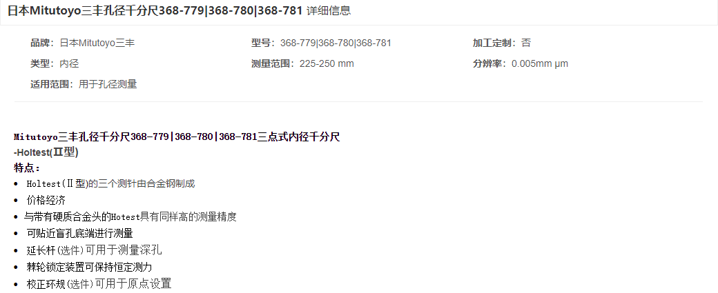 本網(wǎng)頁所展示的有關(guān)【三豐 368-779|368-780|368-781孔徑千分尺】的信息/圖片/參數(shù)等由的會員【日本三豐mitutoyo-深圳柏萊科技有限公司 】提供,由柏萊儀器網(wǎng)-專業(yè)銷售儀器儀表服務(wù)商-深圳柏萊科技有限公司會員【日本三豐mitutoyo-深圳柏萊科技有限公司 】自行對信息/圖片/參數(shù)等的真實(shí)性、準(zhǔn)確性和合法性負(fù)責(zé),本平臺(本網(wǎng)站)僅提供展示服務(wù),請謹(jǐn)慎交易,因交易而產(chǎn)生的法律關(guān)系及法律糾紛由您自行協(xié)商解決,本平臺(本網(wǎng)站)對此不承擔(dān)任何責(zé)任。您在本網(wǎng)頁可以瀏覽【三豐 368-779|368-780|368-781孔徑千分尺】有關(guān)的信息/圖片/價(jià)格等及提供 【三豐 368-779|368-780|368-781孔徑千分尺】的商家公司簡介、聯(lián)系方式等信息。