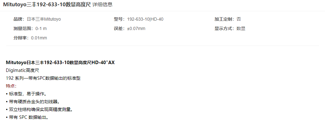 本網(wǎng)頁所展示的有關(guān)【三豐 192-633-10數(shù)顯高度尺】的信息/圖片/參數(shù)等由的會員【日本三豐mitutoyo-深圳柏萊科技有限公司 】提供,由柏萊儀器網(wǎng)-專業(yè)銷售儀器儀表服務(wù)商-深圳柏萊科技有限公司會員【日本三豐mitutoyo-深圳柏萊科技有限公司 】自行對信息/圖片/參數(shù)等的真實(shí)性、準(zhǔn)確性和合法性負(fù)責(zé),本平臺(本網(wǎng)站)僅提供展示服務(wù),請謹(jǐn)慎交易,因交易而產(chǎn)生的法律關(guān)系及法律糾紛由您自行協(xié)商解決,本平臺(本網(wǎng)站)對此不承擔(dān)任何責(zé)任。您在本網(wǎng)頁可以瀏覽【三豐 192-633-10數(shù)顯高度尺】有關(guān)的信息/圖片/價(jià)格等及提供 【三豐 192-633-10數(shù)顯高度尺】的商家公司簡介、聯(lián)系方式等信息。