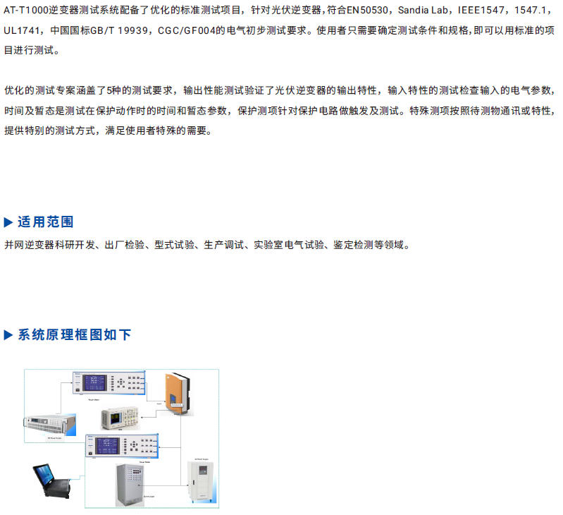適用于并網(wǎng)逆變器科研開發(fā)、出廠檢驗(yàn)、型式試驗(yàn)、生産調(diào)試、實(shí)驗(yàn)室電氣試驗(yàn)、鑒定檢測等領(lǐng)域。