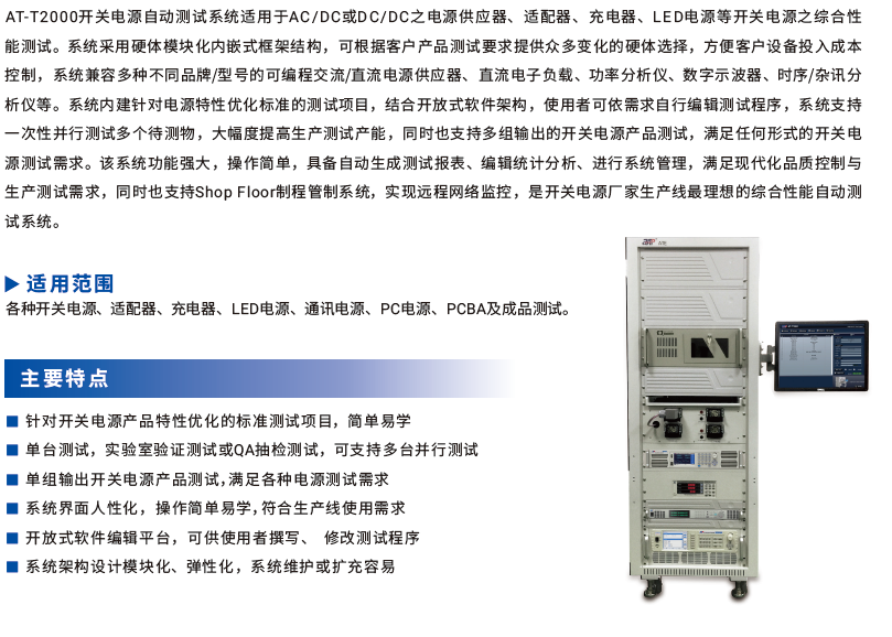 適用于各種開關電源、適配器、充電器、LED電源、通訊電源、PC電源、PCBA及成品測試。