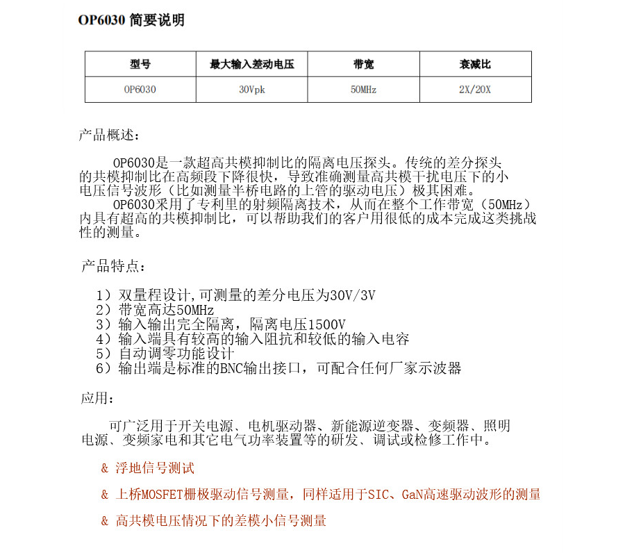 OP6030隔離電壓探頭 超高共模抑制比 30V/50MHz 知用