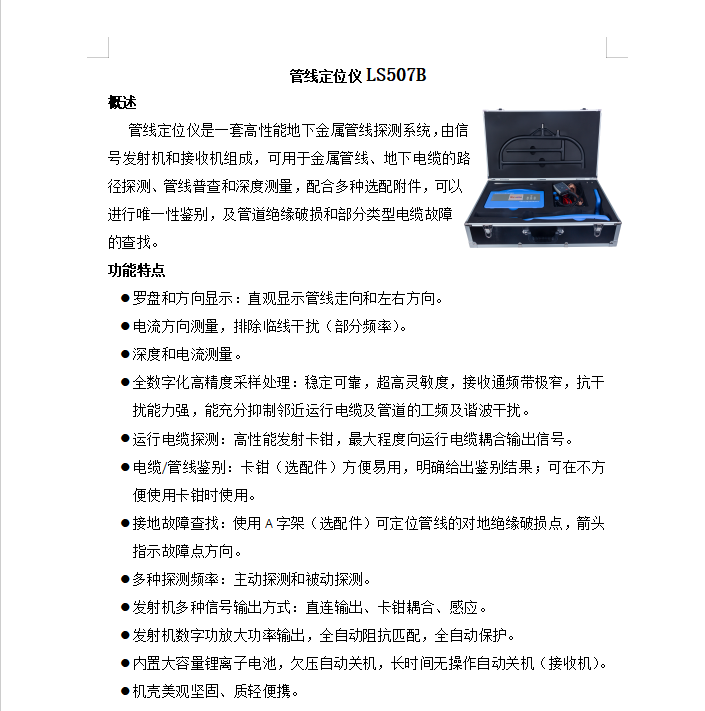 本網(wǎng)頁(yè)所展示的有關(guān)【管線定位儀LS507B】的信息/圖片/參數(shù)等由的會(huì)員【LLS-深圳柏萊科技有限公司 】提供,由柏萊儀器網(wǎng)-專業(yè)銷售儀器儀表服務(wù)商-深圳柏萊科技有限公司會(huì)員【LLS-深圳柏萊科技有限公司 】自行對(duì)信息/圖片/參數(shù)等的真實(shí)性、準(zhǔn)確性和合法性負(fù)責(zé),本平臺(tái)(本網(wǎng)站)僅提供展示服務(wù),請(qǐng)謹(jǐn)慎交易,因交易而產(chǎn)生的法律關(guān)系及法律糾紛由您自行協(xié)商解決,本平臺(tái)(本網(wǎng)站)對(duì)此不承擔(dān)任何責(zé)任。您在本網(wǎng)頁(yè)可以瀏覽【管線定位儀LS507B】有關(guān)的信息/圖片/價(jià)格等及提供 【管線定位儀LS507B】的商家公司簡(jiǎn)介、聯(lián)系方式等信息。
